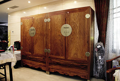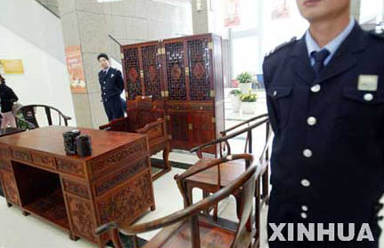 2005年10月25日,一套售价超过一千万元的红木家具在杭州一家具城亮相。图片来源:新华网