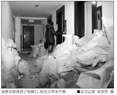 昨日,家住沈阳市皇姑区金钻铭邸小区的于女士打来电话,说她家楼道里都是装修垃圾,出入很不方便,交了垃圾清运费,为啥物业不管呢?